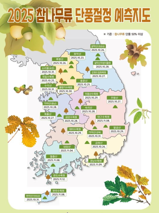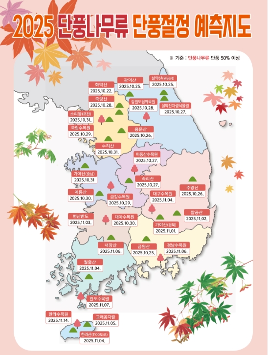 올해는 9월 30일 설악산을 시작으로 단풍 시즌이 본격화됩니다. 전국적으로는 10월 중순~11월 초가 절정 시기로 예상되며, 2주간 아름다운 단풍을 감상할 수 있는 골든타임입니다. 날씨 변화에 따라 다소 유동적일 수 있으므로 실시간 정보 확인은 필수입니다.