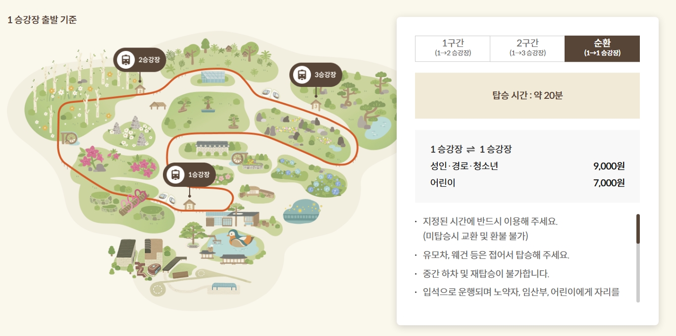| 입구→중앙→정상→분재원→입구 | 약 20분 | 회차당 48석 | 5,000원 |