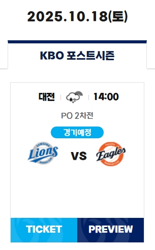| 2차전 | 10월 18일(토) | 14:00 | 대전 한화생명 이글스파크 |