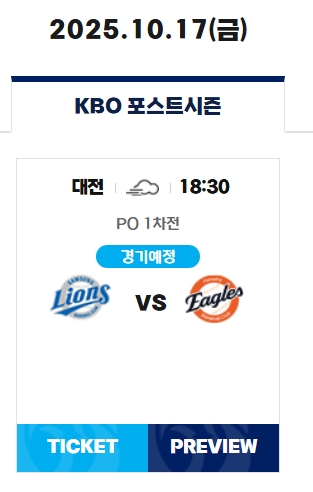 | 1차전 | 10월 17일(금) | 18:30 | 대전 한화생명 이글스파크 |